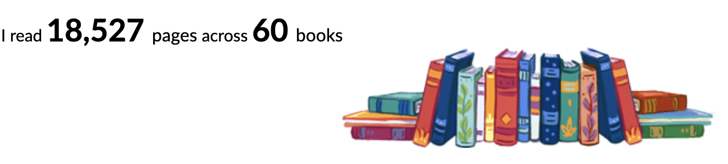 I read 60 books this year, completing 115% of my reading goal of one per week. Last year, I also beat my goal (reading 63) so I think for 2020, I need to set my bar higher and just aim for 60.