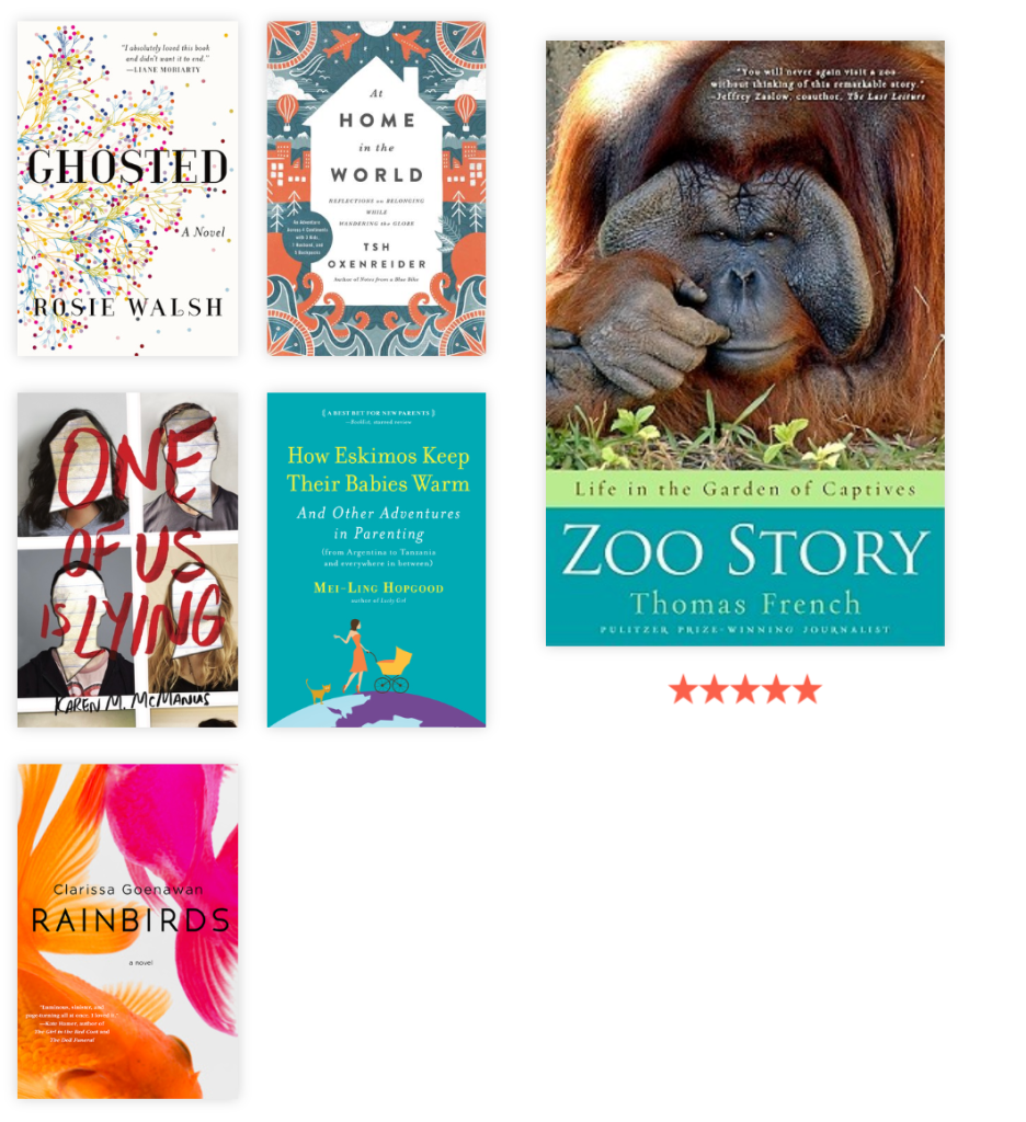 I read a lot of great parenting books (Free Range Kids, Cribsheet and The Science of Mom all stood out to me, the latter two being much more data-driven and scientific), listened to several memoirs (Busy Philipps’ and Chelsea Handler’s were both excellent and surprisingly emotional), and spent a lot of time learning about language (I now know that Arabic is crazy complicated after reading All Strangers Are Kin, and Word by Word became my favorite book about English until I read Words on the Move, and now I can’t decide which was more fun).