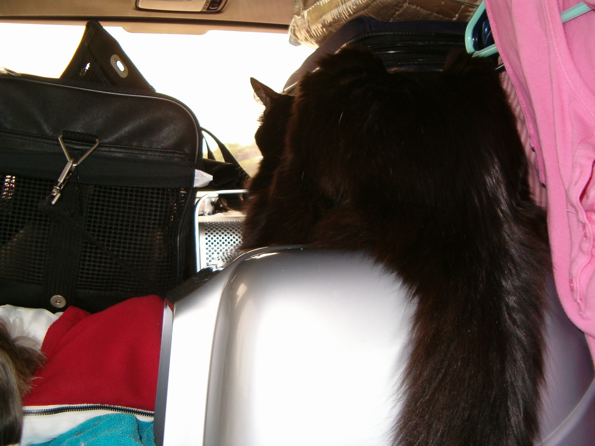Oreo, however, was not nearly as receptive to the idea of traveling for hours in the car. I think she thought we were taking her back to the vet like we did two days ago (also known as the lady-who-sticks-things-up-her-butt), but after about an hour in the car, Oreo realized that we were not headed for the vet’s. She got out of her carrier because I had inadvertently left it unlatched and she was roaming the car, howling at the passing cars and rolling scenery. Where are they taking me? I’m sure she wondered, thinking we were crazy to even consider hauling a cat on such a road trip. But she finally calmed down after realizing that no, we were not stopping and no, we were not letting her out.