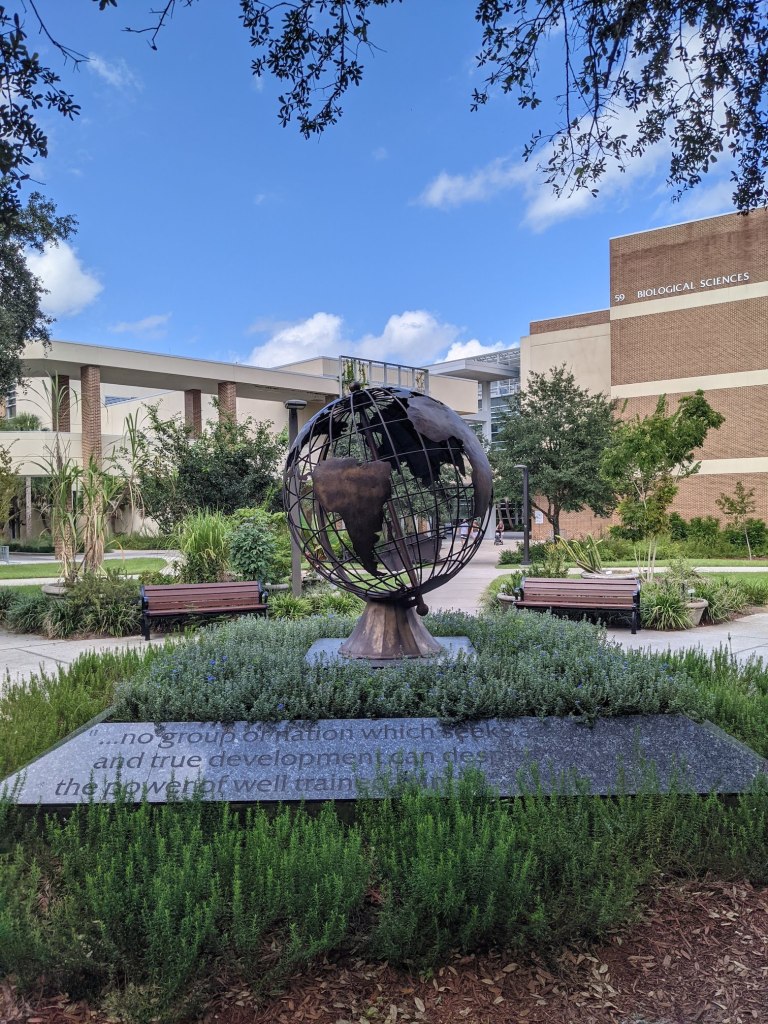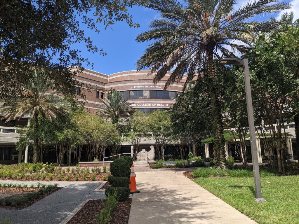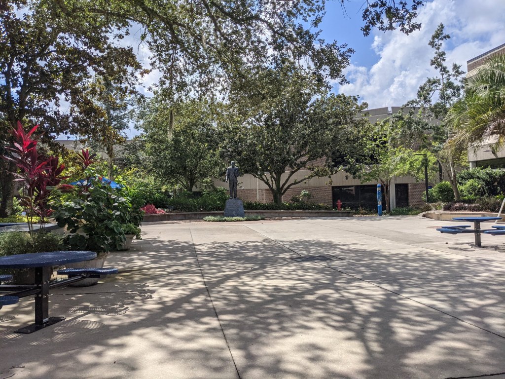 Post beach, we headed to my old stomping grounds: UNF. Now, this place has changed a TON. I had looked at the map online before our trip to reaquaint myself with the area, and it’s almost unrecognizable (in fact, we certainly made a couple wrong turns, despite using GPS). Full of grey, brutalist buildings originally filled with commuter students, UNF never appealed to me for its aesthetics. Compared to all of the other state schools, I liked its location and its size. The campus hasn’t expanded far past its original boundaries, but what they’ve added — new dorms with swimming pools(!), an updated stadium, a massive brand-spanking new modern student union, what must be an expensive landscaping budget — made it much prettier and made me pretty nostalgic about my first two college years. It was a fun detour that helped me get in lots of steps for the day.🙂