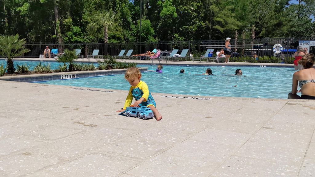The Playground! The scenery! The Village! It was all so lovely. Very well maintained and scenic, full of beautiful landscaping. The Village at Baytown Wharf, though cheesy and fabricated, provides lots of all-age entertainment, retail, and food options that made it a convenient place to spend a couple hours to entertain all of us, every day. Lots of good photo ops for Mama 🙂 One of the BEST parts of the Village was the massive, all-ages playground called the Treehouse. We visited it several times and the Mooch never got tired of running around; he’s still not into slides, but he sure had run climbing and running.