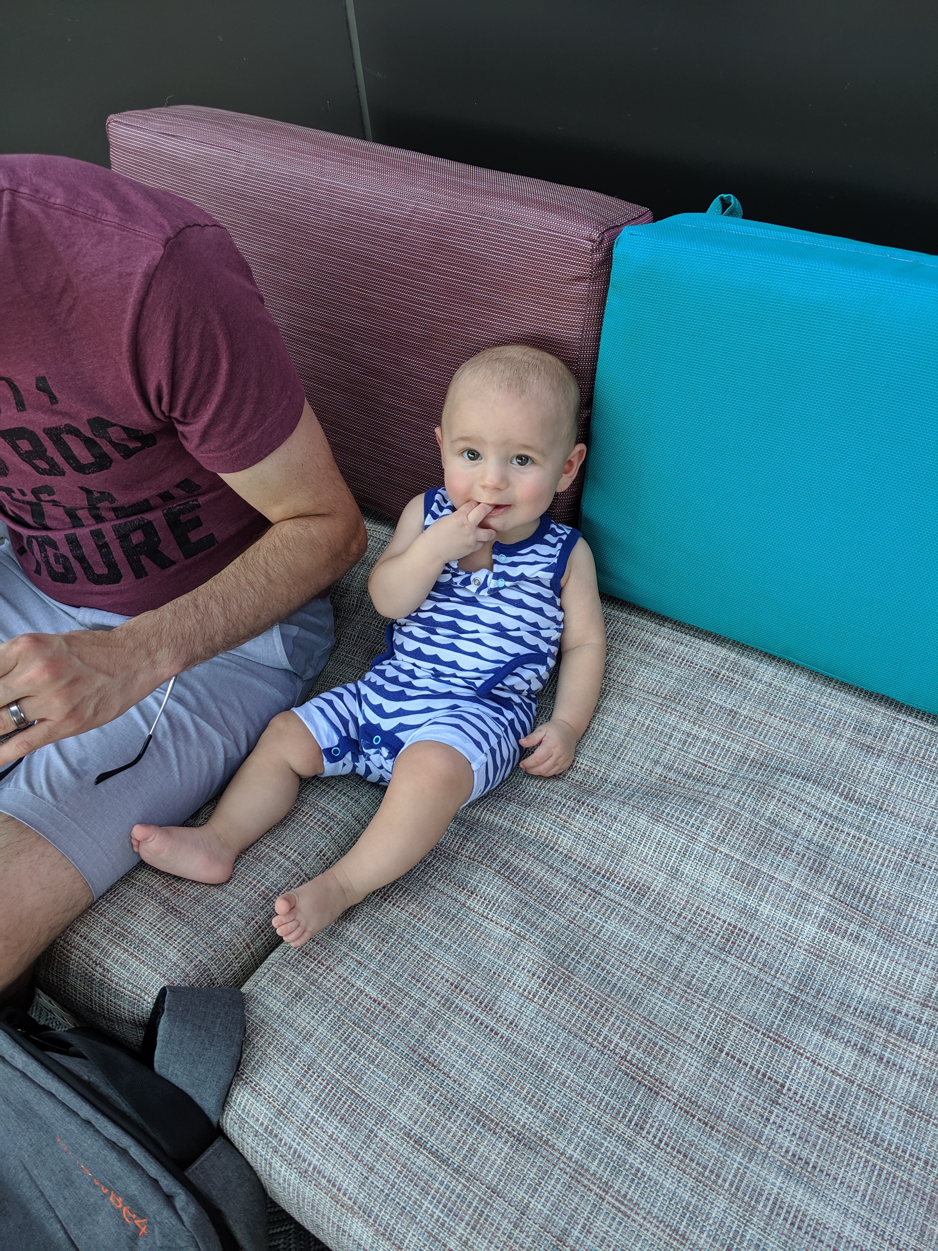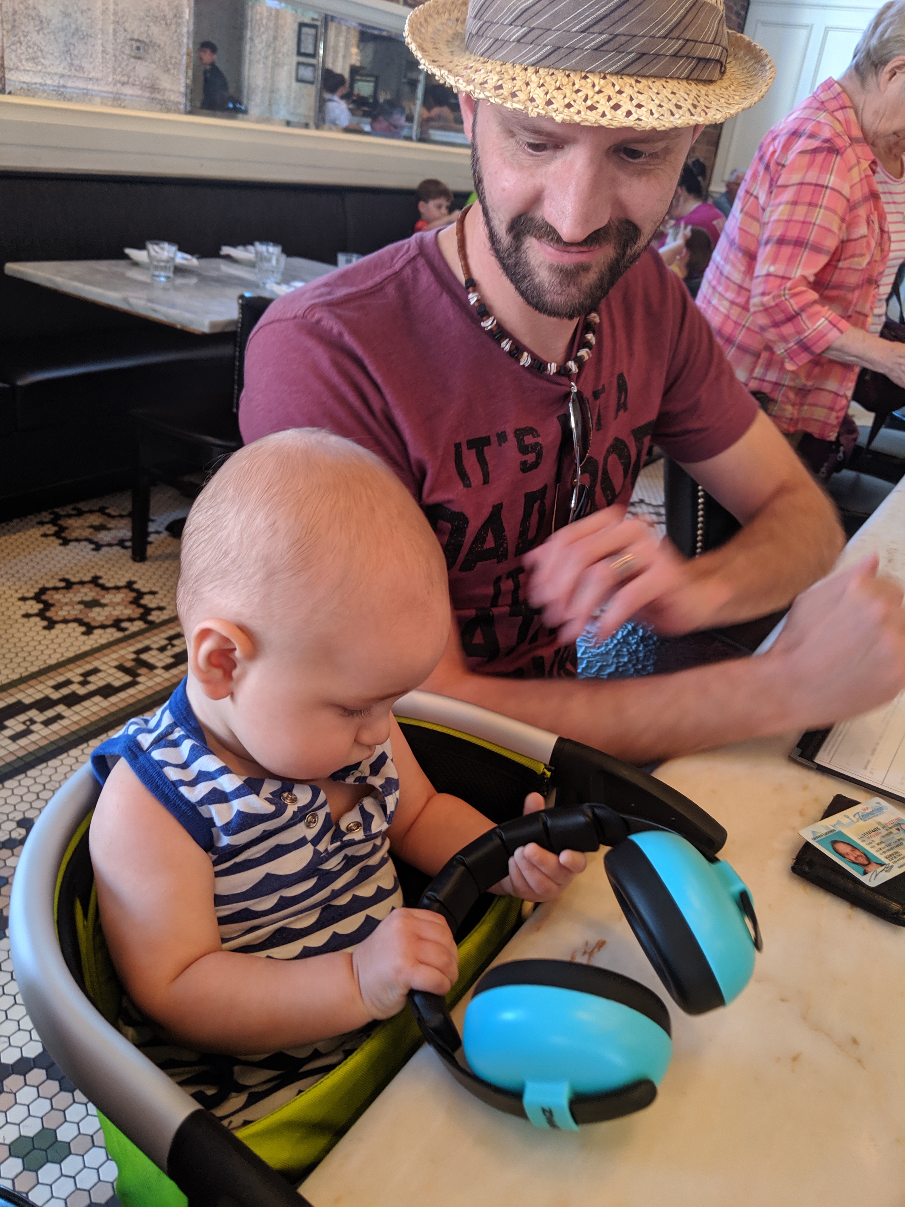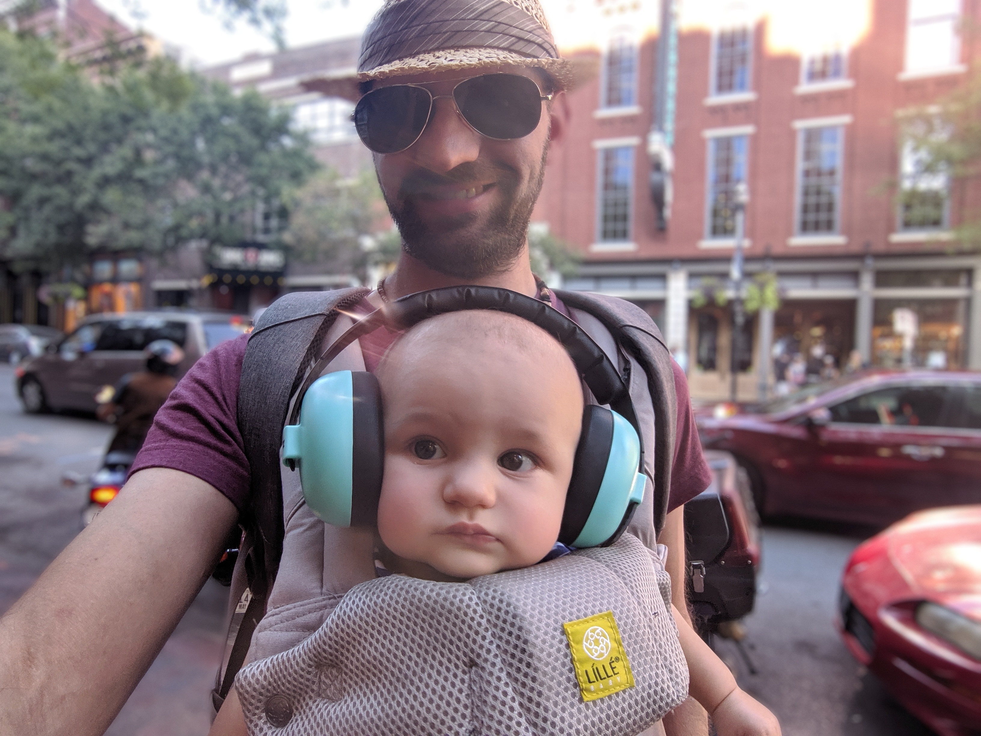 We have experienced the pain-in-the-assery of pushing a stroller downtown and likely won’t do it again. Not only are people oblivious to their surroundings, but there are too many non-stroller friendly obstacles in your path (which makes me really feel for wheelchair-bound folks or anyone who needs those ADA-compliant sidewalks and ramps, oof.) So baby wearing is the optimal choice here and (I’m betting) in most urban exploring situations. By leaving the stroller in the car, you do lose a lot of valuable storage space though, so we brought a second backpack to carry his Lobster, my purse, and overflow items that didn’t all fit in the diaper bag. Next time: we’re going to consolidate both backpacks into one larger backpack so the baby-wearer isn’t over-saddled.Bring headphones.
