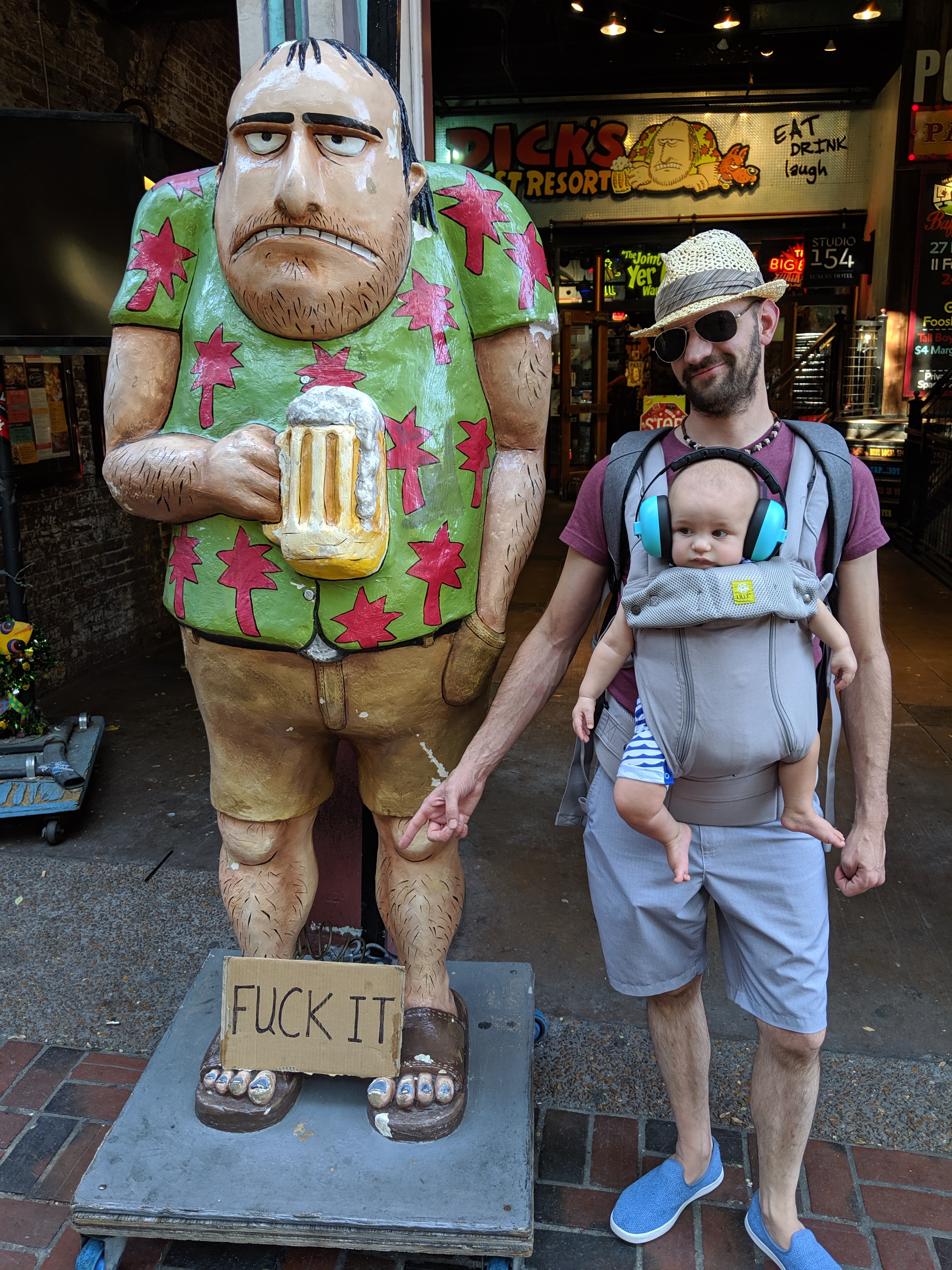 Finally, while I was finishing up my morning pumping session, I suggested downtown again: It wasn’t *that* hot outside and there were plenty of air conditioned places for us to escape into; we’d surely hit my 10,000 step goal traipsing about amongst the crowds giving me what I wanted; if we wore Skyler instead of pushing him in the stroller, navigating the busy sidewalks (and avoiding drunk bros) wouldn’t be hard and he’d enjoy the people watching and the sights and the sounds; going early in the day avoids the drunk bro crowds and there are likely to be families down there too; and there were tons of places to eat and drink, of which we could visit many, satisifying Justin’s request. Downtown seemed like the best compromise!