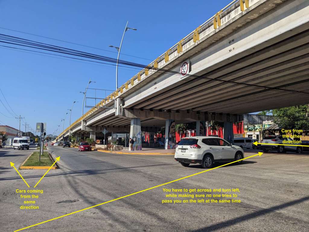 One of the more stressful situations you’ll encounter driving in Playa is crossing Avenida 50. Avenida 50 basically divides the city into two parts; you won’t find as many expats or tourists north of Avenida 50. Highway 307 runs on top of Avenida 50 – literally. When entering the highway, you have to first cross one direction of Avenida 50 – which is actually split into two sections itself: one for through-traffic closer to the highway, and one for turning onto streets and into businesses closer to the city. The first few times I crossed Avenida 50 to merge onto the other side and drive towards the highway entrance, I was almost side-swiped by taxis. You really have to stake a claim to your space on the road. Don’t leave enough space for them to sneak up along your side.