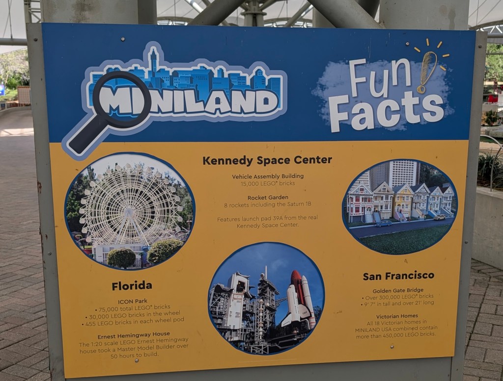 - Miniland USA, featuring models of USA locations, originally built in 2011 and made of 32 million legos!