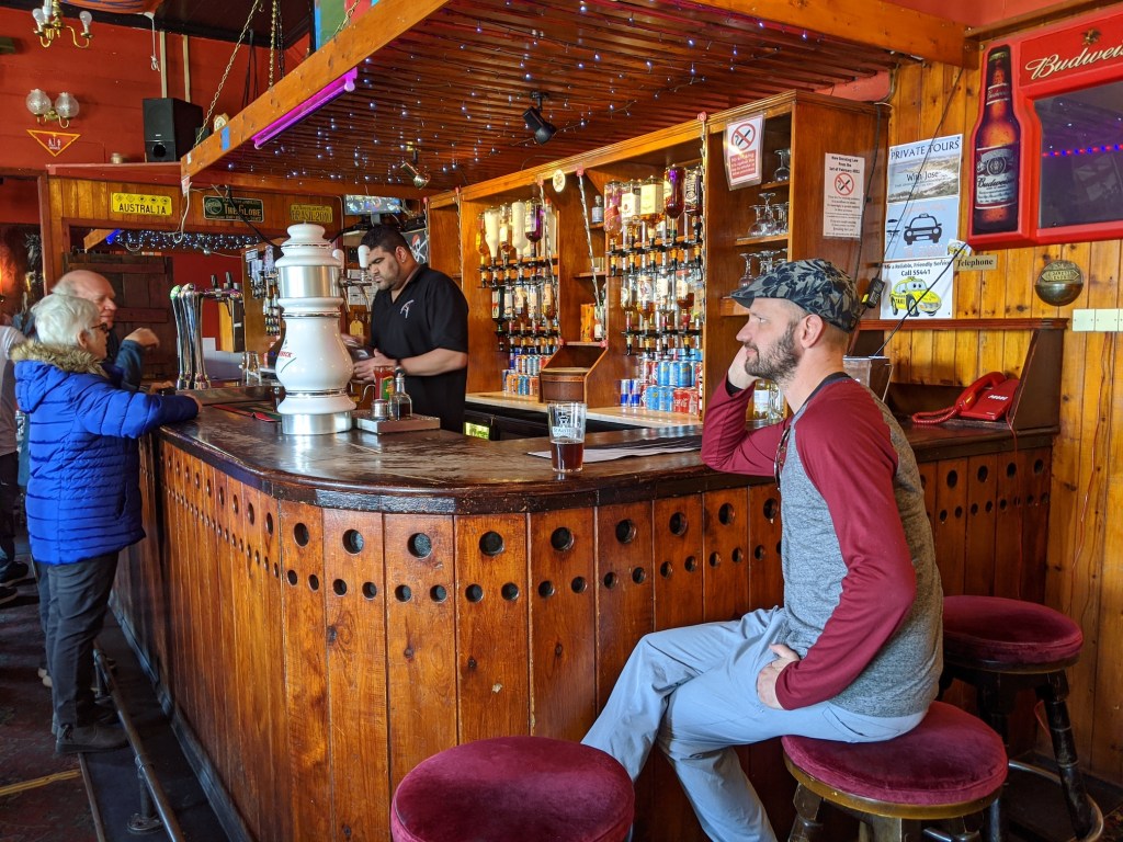 Everyone we met spoke in a crisp, polite British accent, talking about the locally grown diddle dee berries, and gift shop prices were listed in British pounds. When my dad, husband, and I walked into the Globe Tavern to have a quite bite before our scheduled tour, it was like being transported halfway across the world. I dont think we could have conjured a more quintessential divey British pub. My dad approached the bar, asking if they served food, and the bartender responded, “Fish and chips.” So my dad had lunch, my husband ordered a pint, and because they didn’t take credit cards, Justin offered a $20 American bill that the bartender pocketed with a nod.