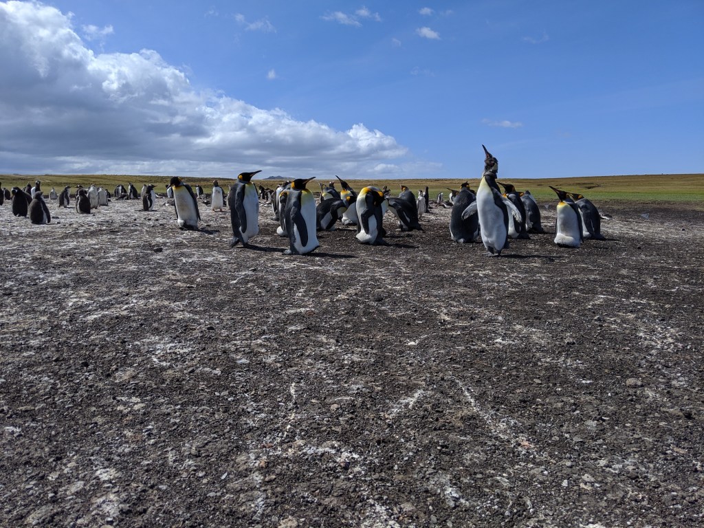 Most of the penguins that we witnessed were young, children and teens, waiting for their parents to come back from the day’s hunt (to deposit regurgitated fish into their mouths). They were chasing each other around, making weird noises (almost like donkeys at times), or bothering the parent that stuck around (usually the father). In the King penguin circle, you could even see tiny little babies hiding under the folds of their father’s bellies, staying warm and waiting for their mothers to return.