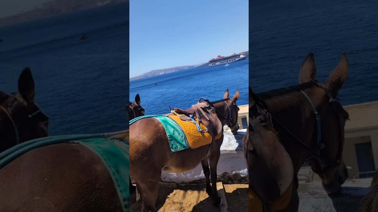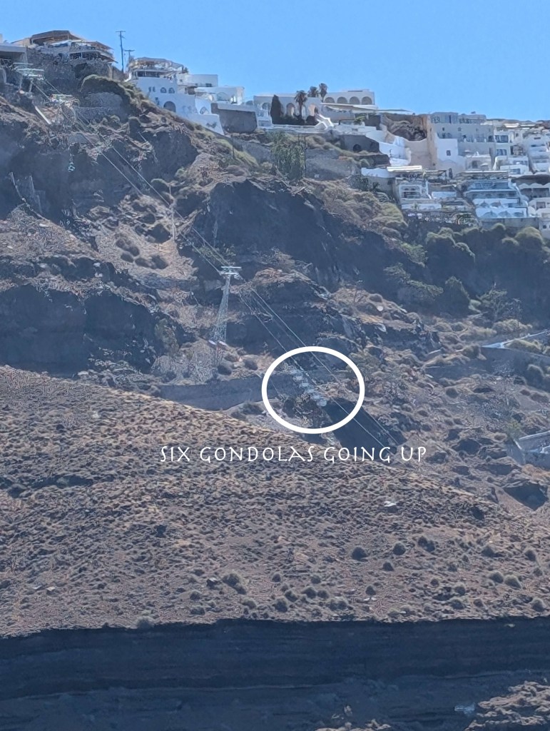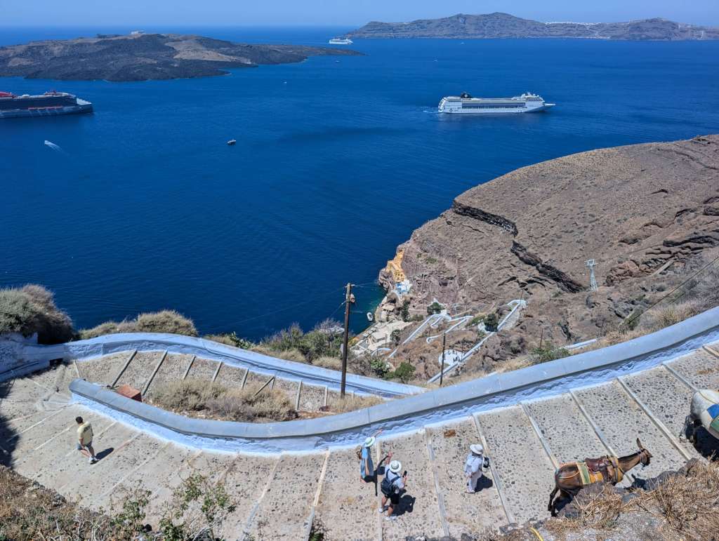 In addition to taking a tender to get to the port itself, we would then have to get from the base of the caldera and cliffs of the island up to the town of Fira, the capital. There are three methods for getting to the top of the island: taking a cable car, walking, or riding a donkey.