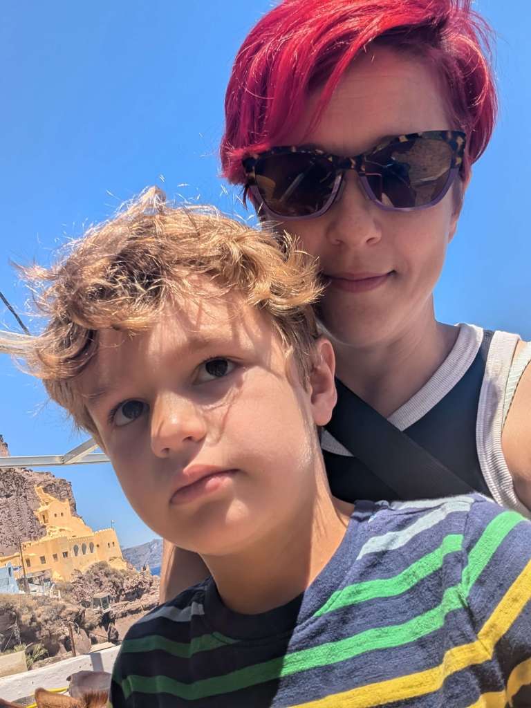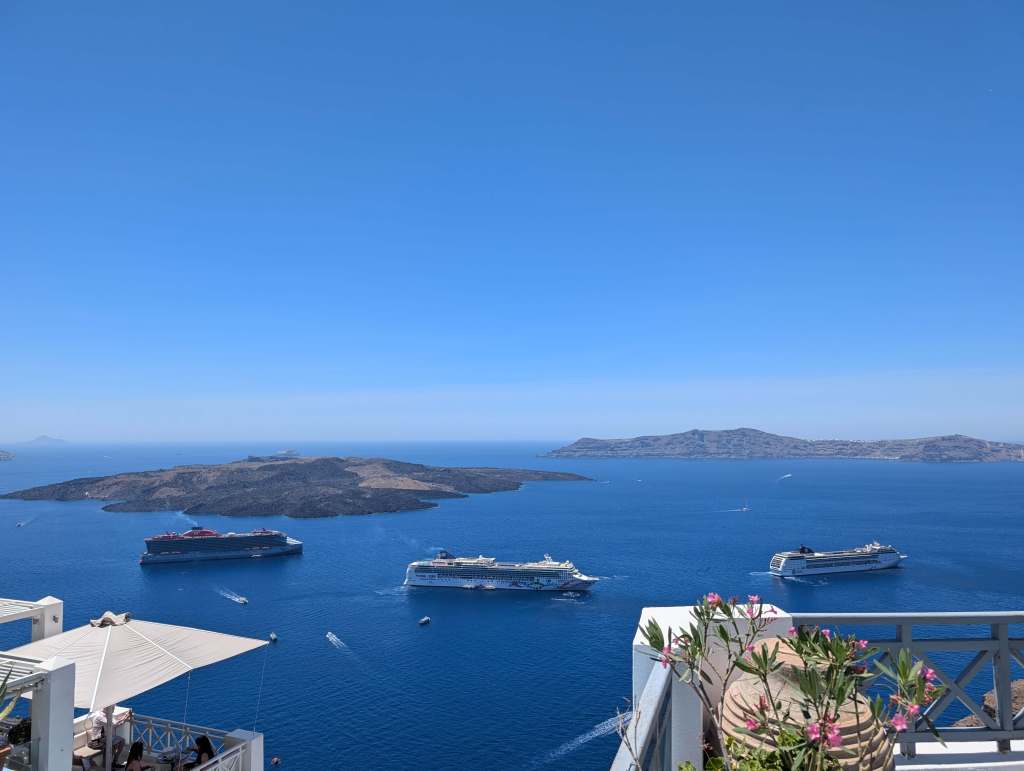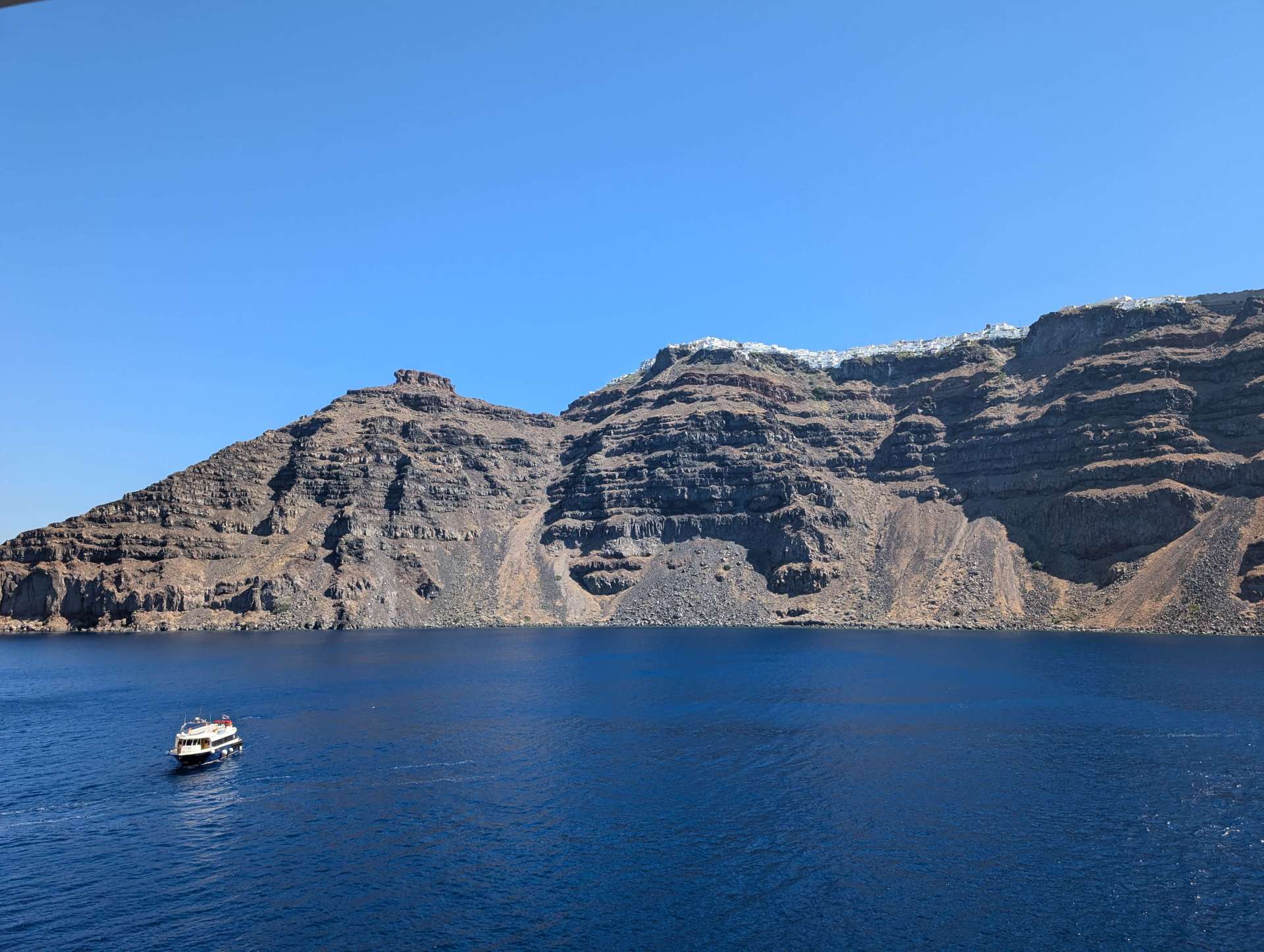 Santorini is a volcanic island with a caldera, formed by a massive volcanic eruption around 3,600 years ago. The caldera is surrounded by steep cliffs, giving the island its dramatic landscape. This also makes it a more challenging port to access. When I learned that it was a tender port, my anxiety spiked. My claustrophobia makes it difficult for me to be on small boats, and every time I’ve had to ride a tender boat in port, I have to pull out every anti-anxiety tactic from my toolbox to deal with the stress. (I envy all of you who are not bothered by these things!)
