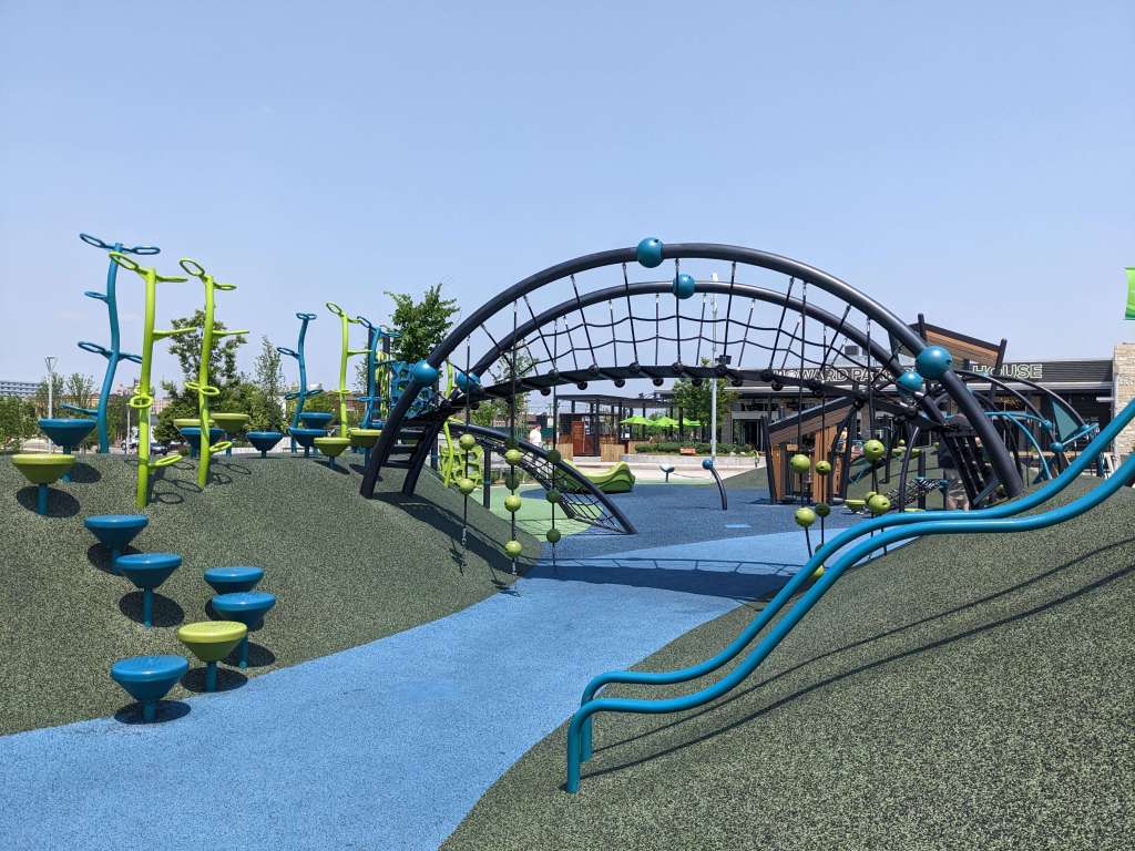 Off to the side of the Howard Park playground, right in front of the classy little Public House restaurant, is a set of water fountains and jets which functions as a splash pad. At night, they light the fountains with a water show, but during the day, kids run freely through the water. Our son splashed around for nearly an hour while we sat several yards away, watching from our table at the Public House, eating lunch and sipping a mid-day cocktail.