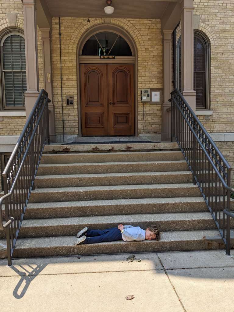 My son could have cared less about it (hence the time spent at the playground!) and we may have forgotten to pack the stroller (whoops!) so he was in a bad mood for nearly our entire visit, which lasted less than 90 minutes. The Basilica of the Sacred Heart, Grotto of our Lady Lourdes, and Touchdown Jesus (the Word of Life mural) were the three “must sees” that we made it to before the child’s temperament demanded that we leave. You could easily spend a few hours meandering the pathways and going inside the various buildings, learning the history of the school and the Fighting Irish. Unless you have a tired, crabby 4 year old who refuses to use his legs. (“My legs are so tired!”)